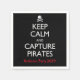 Un thème pirate amusant avec une image de drapeau pirate ancien représentant une tête de mort et des os entrecroisés, ainsi qu'une reprise des anciennes affiches britanniques « Keep Calm ». Celle-ci dit « Gardez votre calme et capturez les pirates » - parfait pour Halloween, la journée « Parlez comme un pirate » ou toute fête d'anniversaire sur le thème pirate ou autre événement pirate.