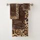 Ces serviettes beiges crème sont décorées dans un style patchwork captivant inspiré de la faune africaine. Les motifs de guépard bordé se mêlent aux motifs géométriques dans un riche brun Hershey, célébrant la beauté naturelle du continent.