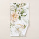 Serviettes florales élégantes avec des fleurs pastel douces et des feuilles vertes exposées sur un mur clair. L'une est accrochée, l'autre pliée, créant une ambiance tranquille.