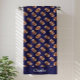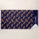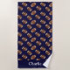 Cette serviette de plage de football est dotée d'un motif continu de ballons de football ainsi que d'une couleur de fond bleu foncé et d'un espace pour ajouter votre nom.