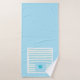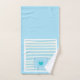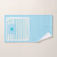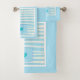 Set tre asciugamani bagno, fondo celeste con maladie righe logo appartamento per vacanze.