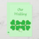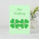 Peinture de deux shamrocks verts, quatre trèfles en feuilles, parés de points dorés, imprimés sur les invitations de mariage. customisez facilement le texte sur les formulaires modèles.