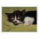 "Shy Tuxedo Kitten" de Catherine Sherman. Un chaton en tuxedo aux yeux verts timide repose sur une couverture verte qui correspond à ses yeux.