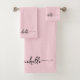 Ensemble de serviettes de bain rose poudré personnalisées avec monogramme moderne chic élégant et nom en écriture script. Ce design délicat présente un nom personnalisé dans une calligraphie à la main cursive avec empattements (ou typographie) en noir sur fond rose poudré ou rose bébé. Cadeau féminin élégant et stylé pour une pendaison de crémaillère, ainsi que pour un anniversaire, un enterrement de vie de jeune fille, un mariage, un sweet 16, une soirée bachelorette, la fête des mères, un anniversaire de mariage et pour une fête de remise de diplôme. C'est pour la fille qui aime les choses élégantes et stylées.
