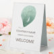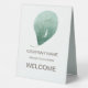 Panneau de la tente de table de la typographie de l'entreprise de bienvenue de la feuille. Offrez un accueil à la mode à vos estimés délégués présents à l'événement de l'entreprise ou aux visiteurs qui entrent dans notre lieu de travail. L'approche contemporaine présente une exquise grande feuille d'eucalyptus placée en haut, complétée par une élégante typographie ci-dessous. Ce design enchanteur vous permet de personnaliser facilement votre nom d'entreprise et votre message d'accueil chaleureux. Toutes les mises à jour apportées aux mots refléteront de façon transparente de part et d'autre, car ce design captivant fait la différence entre l'avant et l'arrière.
