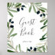 Ce signe de livre d'or de branche d'olive moderne est parfait pour un mariage boho. Le design rustique mais élégant présente des feuilles vertes botaniques simples à l'aquarelle et des olives noires sur une petite branche avec une ambiance méditerranéenne classique.