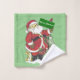 Ce linge de toilette pour votre salle de bain est vert clair avec le Père Noël debout dans un tas de neige tenant un Joyeux Noël signe un arbre avec des perles rouges entourées d'oiseaux et de petits animaux dont un lapin et un écureuil.