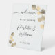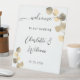 Un panneau d'accueil moderne, élégant et mariage. Arrière - plan blanc, orné d'eucalyptus dorés, sprigs. Personnalisez et ajoutez vos noms et la date du mariage. Lettres de couleur noire.