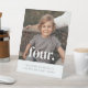 Une Affiche de bienvenue d'anniversaire moderne de 4ème anniversaire avec espace pour ajouter votre propre photo et le mot 'four.' sur le dessus. Vous pouvez également remplacer le mot "quatre" par n'importe quel autre mot, nom ou numéro si vous préférez.
