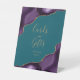 Un signe chic et élégant pour remercier les invités mariages à votre table Cartes et Cadeaux. Les mots "Cartes" et "Cadeaux" apparaissent dans la calligraphie de l'écriture manuscrite de couleur or, avec "merci !" ci-dessous dans la police serif. Des motifs d'aquarelle violet taillés avec de l'or imitation parties scintillant encadrent le message en deux coins sur un arrière - plan bleu turquoise.