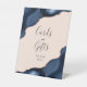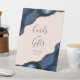 Un signe chic et élégant pour remercier les invités mariages à votre table Cartes et Cadeaux. Les mots "Cartes" et "Cadeaux" apparaissent dans la calligraphie de l'écriture manuscrite grise au fusain, avec "merci !" ci-dessous en police serif. Des motifs d'aquarelle bleu marine taillés avec de l'or rose faux parties scintillant encadrent le message en deux coins sur un arrière - plan blush. Voir notre collection pour la suite de faire-part de mariage et la papeterie de jour correspondant.