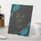 Un signe chic et élégant pour remercier les invités d'avoir assisté à votre mariage et de les accueillir à votre table de faveurs. Les mots "Merci" apparaissent dans la calligraphie de l'écriture manuscrite de couleur or, avec les mots "pour venir" et l'invitation "prendre un" ci-dessous dans la police serif. Des motifs d'aquarelle bleu turquoise découpés avec de l'or imitation parties scintillant encadrent le message en deux coins sur un arrière - plan non noir. Voir notre collection pour la suite de faire-part de mariage et la papeterie de jour correspondant.