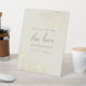 Elégant, vintage, boho mariage or Aidez-nous à capturer le signe de table Love avec dentelle dorée fleurie et script de calligraphie moderne.