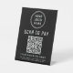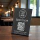 Un simple panneau de piédestal de table noire moderne pour votre entreprise avec un code QR pour les clients à scanner pour les paiements. Ajoutez votre logo, votre nom d'entreprise, votre code QR, votre numéro de téléphone et votre adresse de rue dans une simple typographie blanche.