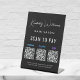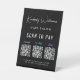 Chic noir pedestal panneau de table pour votre entreprise avec Venmo, Paypal et Zelle QR codes pour les clients à scanner pour les paiements mobiles et votre nom ou marque présenté dans un élégant script de signature blanche. Téléchargez vos codes QR et ajoutez vos coordonnées en lettres blanches propres.