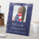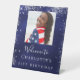 Un signe de bienvenue pour une fête d'anniversaire girly et glamour de 21e (ou tout âge). Un arrière - plan bleu marine avec d'élégants éclats de faux argent. La couleur bleue est inégale. Personnalisez et ajoutez une photo, nom et âge 21. Lettres blanches.