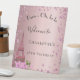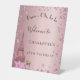 Un panneau d'accueil moderne, design et glamour pour une fête d'anniversaire du 18ème (ou tout âge), à thème parisien. Un arrière - plan à l'allure métallique rose vif aux coeurs étincelants roses et la tour Eiffel fleurie. Personnalisez et ajoutez un nom.