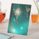 Gold, antique keys with gears and dials hang on gold chains on luminous green background.