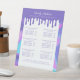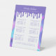 Hologramme coloré rose et violet iridescente liste panneau de piédestal parfait pour coiffeurs, maquilleurs, ongles et bien plus encore. Le design présente notre amusant arrière - plan de texture holographique rose et violet avec une goutte violette. Customisé avec le nom de l'entreprise, les coordonnées, la liste de vos produits/services et les prix.