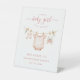 Accueillez vos invités avec charme en utilisant cette petite cloche de garde d'enfants signe de piédestal d'accueil. Le design comprend des articles pour bébé d'aquarelle douce (rougissant rose, de minuscules chaussettes et un lapin peluché) accrochés à une corde en jute aux accents d'eucalyptus. Placé sur un arrière - plan blanc propre aux tons pastel délicats, il apporte une touche chaleureuse et moderne à toute douche pour bébé.