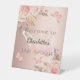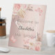 Un signe de bienvenue pour un Baby shower, célébrant une petite fille. Arrière - plan rose à dégradé d'or décoré de roses roses, de fleurs, d'herbe de pampas et de papillons. Personnalisez et ajoutez un nom.