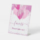 Un panneau de table pour les cadeaux de fête. Un fond blanc avec des étincelles factices élégantes et des ballons rose pastel et rose vif. Lettres roses.