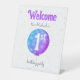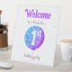 Simple et amusant signe de bienvenue violet premier anniversaire avec l'illustration d'un ballon bleu sur un arrière - plan aquarelle. Parfait pour ajouter à votre table de rafraîchissements. Illustré et dessiné par Patricia Alvarez.