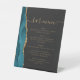 Un panneau élégant pour votre menu de bar mariage. Les mots "menu barre" apparaissent dans la calligraphie d'écriture manuscrite couleur or avec des swashes au début et à la fin, avec le texte personnalisable ci-dessous. Une aquarelle bleue turquoise, ornée d'une parties scintillant en faux or, orne la bordure gauche sur un arrière - plan noir en ardoise. Voir notre collection pour la suite de faire-part de mariage et la papeterie de jour correspondant.