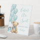 Babies Are Sweet – Please Take A Treat. This cute and charming tabletop sign features an adorable watercolor teddy bear with teal blue balloons, large and off the left side, adding a playful touch. “Babies Are Sweet” appears at the top in large blue script, with “Please Take A Treat” below in matching typography. The design is simple and classic, with gray text in a mix of serif and script fonts. You can customize the background color to fit your theme.