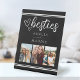 Besties Modern Photo Collage Black and White Pedestal Sign. Celebrate your unbreakable bond with this charming "Besties" collage photo design. Featuring a classic black and white aesthetic, this design is perfect for showcasing your favorite memories with your closest friends. The elegant script font for "besties" paired with clean sans-serif text for names adds a touch of sophistication, while the three photo slots allow you to personalize it with cherished moments. This design is an ideal way to commemorate friendship and would make a heartfelt addition to any space, reminding you daily of the special people in your life. Display your favorite snapshots and keep the spirit of your friendship alive with this beautiful best friend keepsake gift.