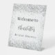 Un panneau de bienvenue pour la fête de mariage. Un fond blanc élégant décoré de confettis argentés faux. Personnalisez et ajoutez un nom. Lettres noires.