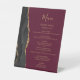Le bord gauche de cet élégant panneau de table de menu mariage moderne est doté d'une bordure en aquarelle noire ornée d'une parties scintillant en faux or. Le mot "Menu" apparaît en écriture manuscrite de couleur or sur un arrière - plan bordeaux. Personnalisez le texte restant avec les noms du couple, la date du mariage et les détails du menu.
