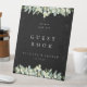Un élégant panneau de mariage de table noire pour votre table de livres d'hôtes. Doté de baies de neige peintes à la main et d'eucalyptus. Tout le texte est entièrement modifiable pour que vous puissiez modifier le message et modifier le style/la couleur/la taille de la police. Coordonner les éléments disponibles.