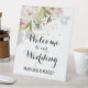Un bouquet floral moderne et élégant rose vif et blanc aquarelle avec l'ombre doucement débordant sur cette enseigne Bienvenue à Notre Mariage Tabletop avec des éclaboussures et des éléments dorés brillants, avec vos prénoms et votre date sous une police moderne.