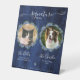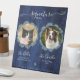 Blue Hydrangeas Wood Signature Animaux de compagnie Boire Pedestal Signer est un magnifique et élégant signe de mariage pour tout amoureux des chiens! Ce panneau de boisson est doté d'une aquarelle d'hydrangées bleues, d'arrière - plan de bois bleu, de verdure et de la possibilité d'ajouter deux photos. Vous pouvez personnaliser tout le texte en faisant un cocktail signature unique.