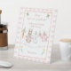 This Please Sign Our Guest Book Pedestal sign features a custom hand-painted frame of a crisp pink ribbon pattern accented with a pink scalloped border, creating a clean, classic, and welcoming look. A sweet watercolor clothesline is strung across the center, proudly displaying tiny, adorable items, each featuring a cute pink clothed bunny in a soft watercolor style. The scene is completed with cute fresh carrots, and bright, cheerful daffodils, all rendered in a soft watercolor style. Easily add your own details and change the font style, size color and placement if you would like to.