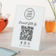 Make it effortless for customers to connect with your brand using this modern tabletop pedestal sign. Designed for countertops, checkout areas, and event tables, this sign features a clean QR code layout that instantly directs customers to your website, menu, booking page, or Facebook, Instagram, and TikTok social media profiles. The minimalist design keeps your branding front and center, with space for your logo at the top and a clear call-to-action that encourages engagement. Perfect for retail stores, cafés, salons, trade shows, pop-ups, and professional events, this sturdy pedestal sign stands upright and remains highly visible without taking up valuable space.