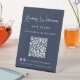 Chic custom blue pedestal tabletop sign for your business featuring your name in a stylish white signature script and business type in simple modern white lettering. Input your website URL address to create a QR code for customers and clients to scan for a list of your products, services, hours, etc. Add your instagram and facebook user ids for customers to follow you on social media.