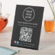 Panneau de piédestal de table noire moderne pour votre entreprise avec votre code QR pour les clients à analyser pour effectuer un paiement, pour voir une liste de vos produits, services et prix, pour faire des rendez-vous, pour s'inscrire, etc. Téléchargez votre logo et votre code QR et ajoutez votre nom d'entreprise, votre numéro de téléphone, votre adresse municipale ou toute autre information dans une simple typographie blanche. Ajoutez vos identifiants instagram et facebook pour que les clients puissent vous suivre sur les médias sociaux.