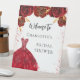 Un panneau de bienvenue pour une fête de mariage. Un fond blanc avec faux strass, paillettes, une robe rouge et des roses rouges, fleurs. Personnalisez et ajoutez un nom.