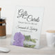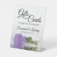 Ce joli panneau de table est parfait pour laisser les clients mariages savoir où laisser leurs cadeaux et cartes. Il présente un design simple mais élégant avec une photo d'un seul rose à long tige couleur lavande violet réfléchissant dans un bassin d'eau avec vagues et ondulations. Le panneau dit : Cadeaux et Cartes, Merci tellement ! Il y a de la place pour vos noms et la date du mariage ci-dessous.