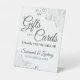 Ce joli panneau de table a été conçu pour faciliter la tâche à vos invités mariages qui souhaitent savoir où laisser leurs cadeaux et leurs cartes. Il présente un design gris et blanc simple mais élégant, avec des lettres de script et des faux plis gris argenté en dentelle dans les coins. Le panneau dit : Cadeaux et Cartes Merci tant ! Il y a de la place pour vos noms et la date du mariage ci-dessous.