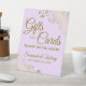 Ce joli panneau de table a été conçu pour faciliter la tâche à vos invités mariages qui souhaitent savoir où laisser leurs cadeaux et leurs cartes. Il présente une conception simple mais élégante de violet lilas et d'or avec des lettres de script et de la dentelle dorée faux feuillages dans les coins. Le panneau dit : Cadeaux et Cartes Merci tant ! Il y a de la place pour vos noms et la date du mariage ci-dessous.