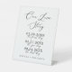 Cette délicate calligraphie noire notre histoire d'amour mariage panneau de piédestal est parfait pour un mariage moderne. Le design minimaliste romantique présente une belle et élégante typographie noire sur un arrière - plan blanc au look épuré et sobre.