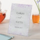 Un fond métallisé argenté faux. Décoré de fausses paillettes violettes. Avec le texte : Cartes et cadeaux. Merci !