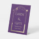 Cartes & Cadeaux Mystical Purple Or Soleil Lune Étoiles Astronomie Céleste Galaxie Cosmique Espace Mariage Événement Piédestal Signe dispose d'un soleil doré, de lune et d'un cadre étoiles sur un arrière - plan violet. A l'intérieur, c'est ton texte. Conçu pour vous par ©2022 Evco Studio www.zazzle.com/store/evcostudio