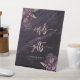 Un panneau élégant pour souhaiter la bienvenue aux invités de votre table Cartes et Cadeaux. Les mots "cartes" et "cadeaux" apparaissent dans une calligraphie rose poussiéreux avec des fioritures au début et à la fin, avec les mots "merci !" en dessous dans une police serif. Une paire de bouquets floraux violets rehaussés de feuillage en feuille d'or rose faux apparaissent dans deux coins, sur une image de fond d'agate aquarelle violet foncé. Voir notre collection pour une suite de faire-part de mariage et de papeterie assortis pour le jour J.