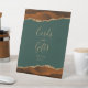 Un panneau chic et élégant pour remercier les invités de mariage à votre table Cartes et Cadeaux. Les mots "Cartes" et "Cadeaux" apparaissent dans une calligraphie dorée, avec "merci !" en dessous dans une police serif. Des dessins d'agate à l'aquarelle orange rouille et rouille, encadrés de paillettes dorées, encadrent le message en haut et en bas sur un fond vert émeraude foncé. Découvrez notre collection pour une suite de faire-part de mariage et de papeterie assortis.