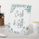 Fleurs de pivoines blanches gaies et feuilles d'aquarelle verte forment une belle bordure sur ce joli panneau de piédestal Cartes et Cadeaux pour un mariage de printemps. Chic, moderne griffe manuscrite accentuée par un joli design floral bleu cornflower.