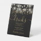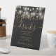 Doté de jolies lampes à cordes, cet élégant panneau de boissons signature noir et or est parfait pour votre fête mariage. Conçu par Thisisnotme©